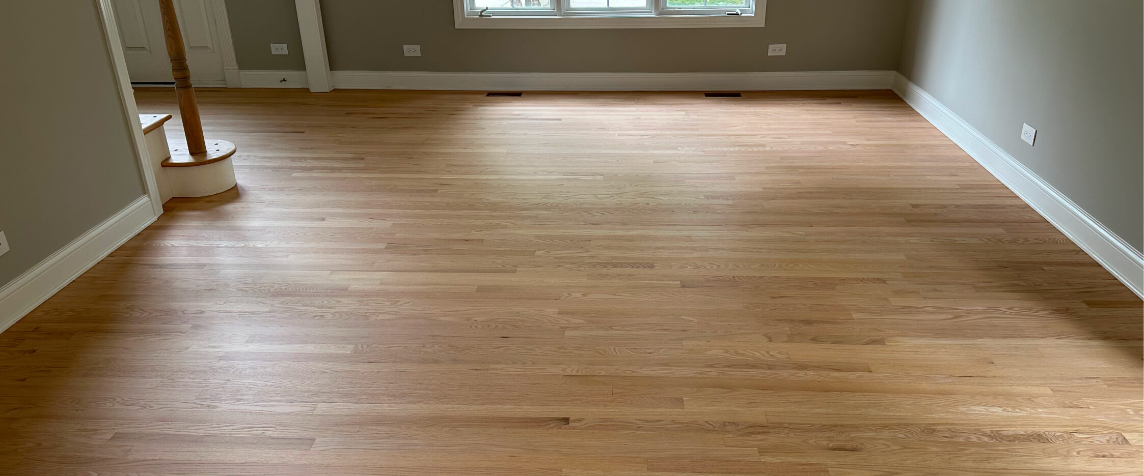 Prefinished floors allow light foot traffic the same day. Site-finished floors are sanded, stained, and coated with guidance on furniture and rug timing. Stairs, treads, thresholds, baseboards, and shoe molding are completed as outlined in your scope.