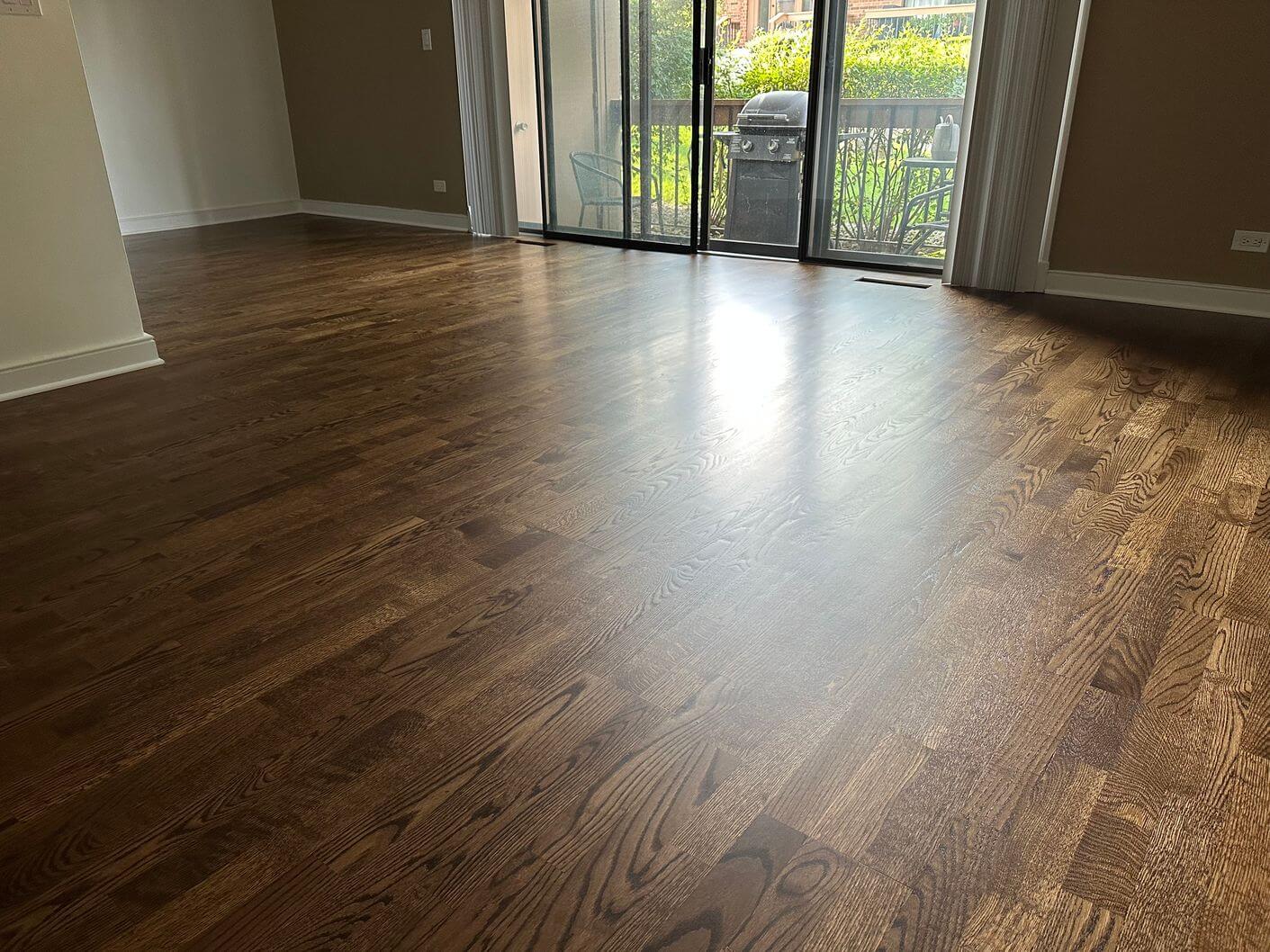 This Burr Ridge condo project involved carefully refinishing floating engineered white oak floors without replacing them. After controlled sanding, minor board work, and a full color change to DuraSeal Espresso, the home felt darker, richer, and much more updated.