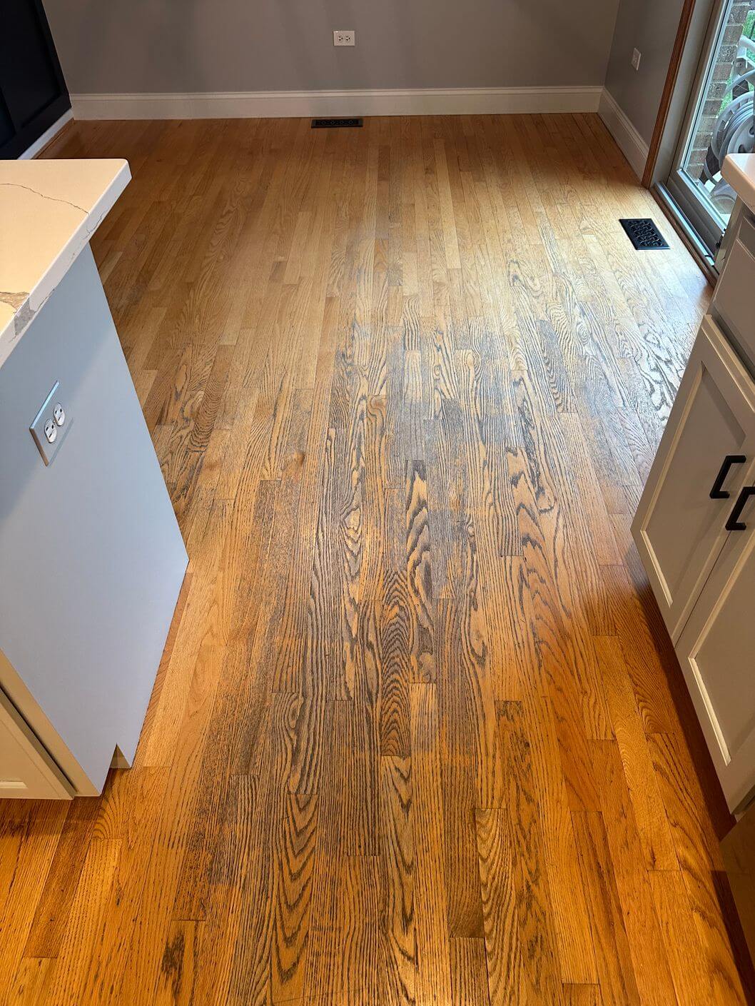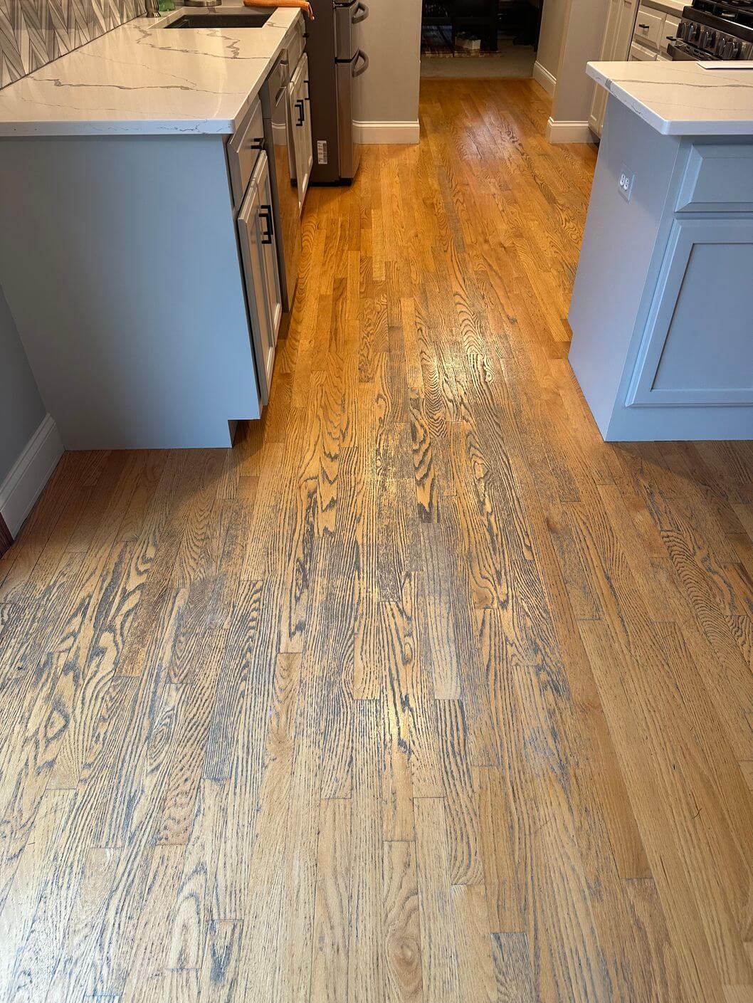 Restored oak kitchen walkway after floor refinishing and Provincial stain application
