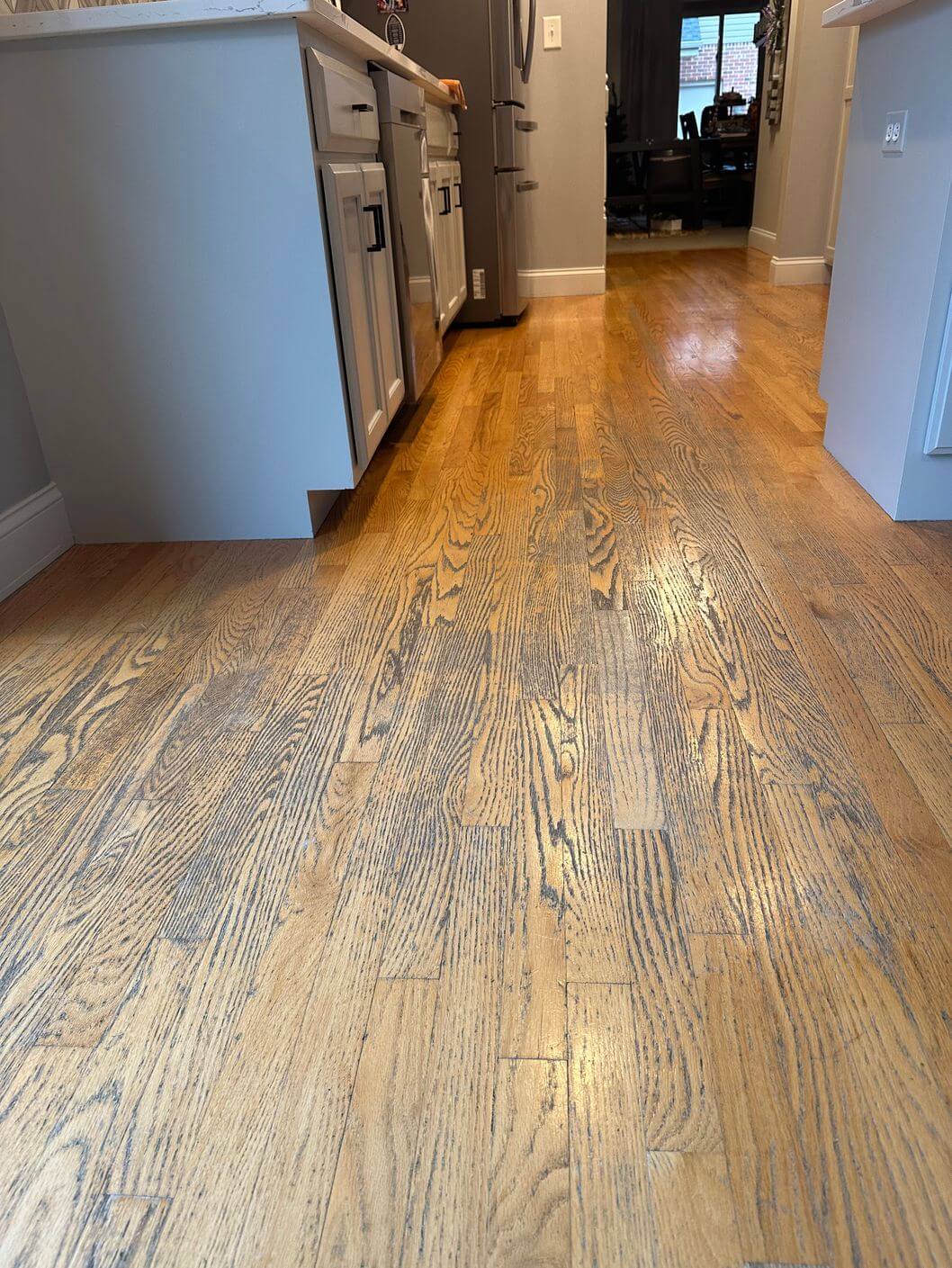 After about 25 years without refinishing, these oak floors were in rough shape. Years of foot traffic had left them dull, faded, and heavily worn, especially in the kitchen, dining room, and hallway. The finish had lost its life, the color looked uneven, and the floors made the space feel older, darker, and much more tired than it should have.